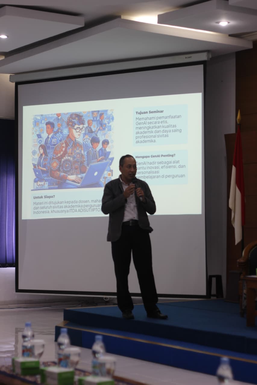 Seminar ini menghadirkan narasumber utama, Prof. Dr. Ir. Imam Riadi, M.Kom., yang membahas perkembangan serta pemanfaatan teknologi Artificial Intelligence (AI) dalam dunia akademik dan profesional. Kegiatan ini diikuti oleh 130 peserta yang terdiri dari mahasiswa internal ITD Adisutjipto serta peserta dari berbagai perguruan tinggi lainnya.